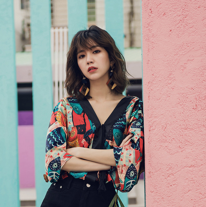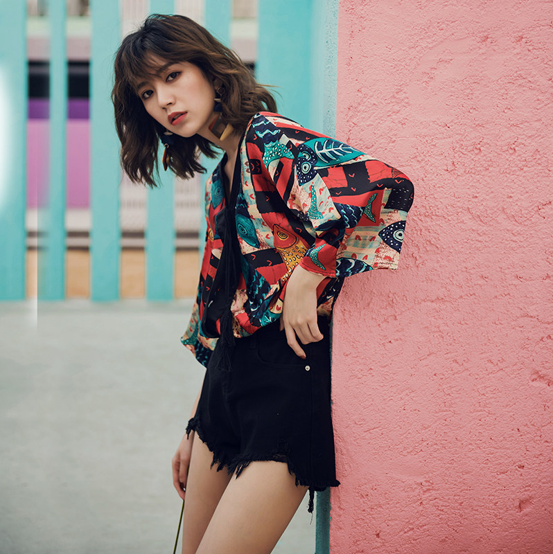 Thailand Bali Bohemian beach chiffon shirt V-neck loose top trumpet sleeve seaside holiday style T-shirt