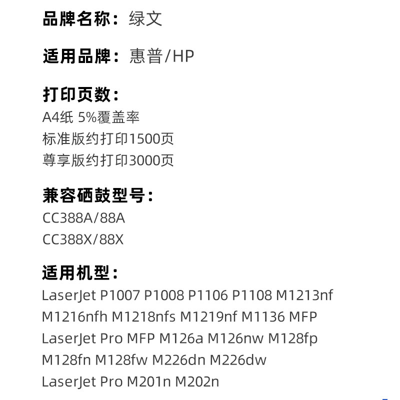 (Standard version CC388A toner cartridge) Standard version capacity-about print 1500 pages (floral type CC388A toner cartridge) printed documents with light fragrance-about print 1500 pages