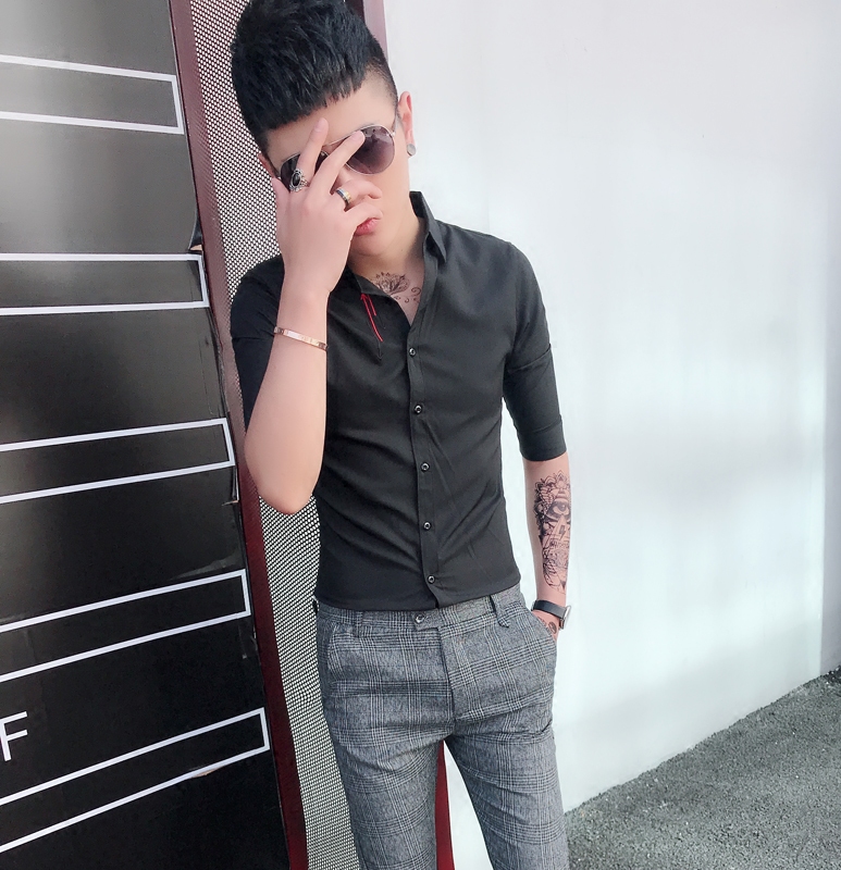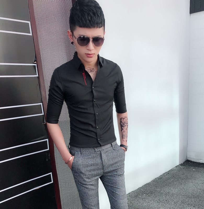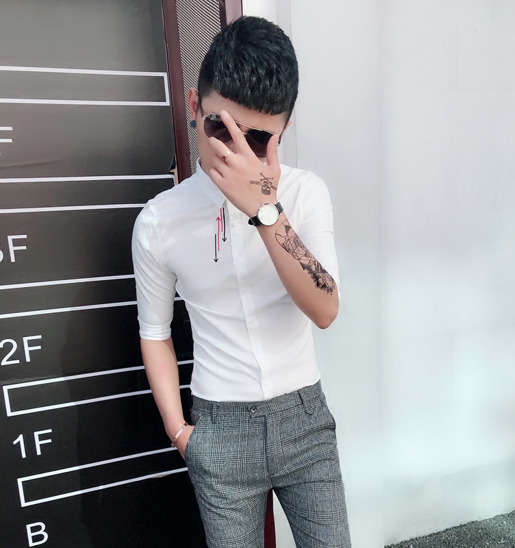 Embroidered new shirt men's five-point sleeves slim fashion Korean shirt trendy hair stylist handsome personality embroidered sleeves