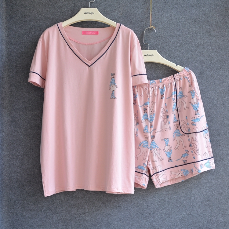 Large size pajamas Xia fat MM woman 200 pounds can wear pure cotton loose and weigh up two sets of V - lead home suits