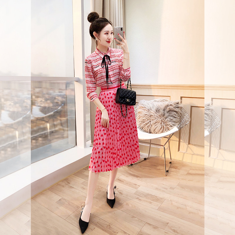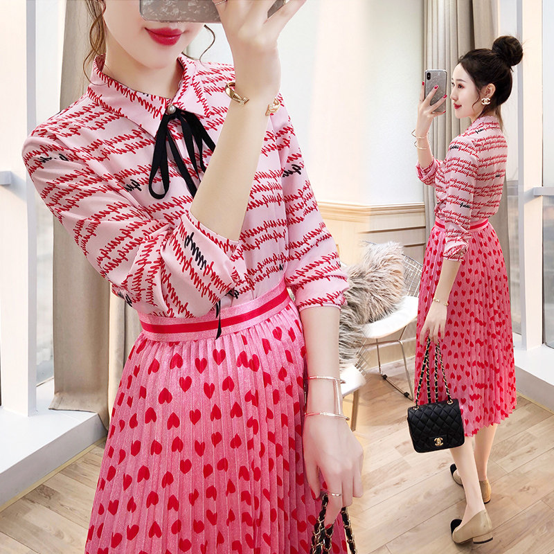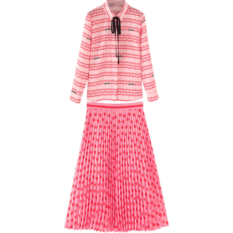 Pleated skirt two-piece autumn suit 2022 new women's shirt printing small fresh pink pure sweet suit