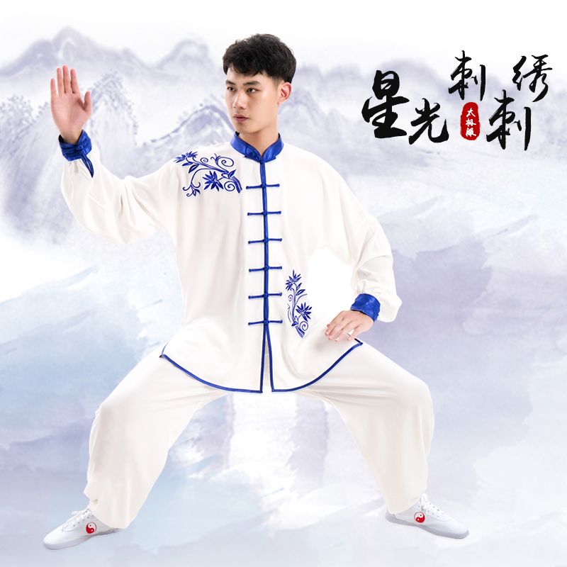 Green Flowers Porcelain Tai Chi Clothing Women's New Male China Wind Embroidery Taijiquan Martial Arts Group Competition Performance White