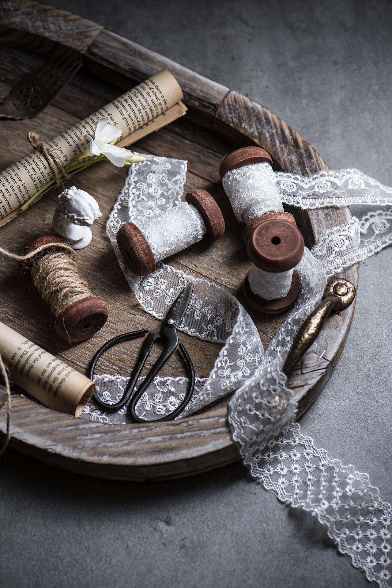 Vintage lace spool French photography props scene with Dora Latin food still life Homemade ins style
