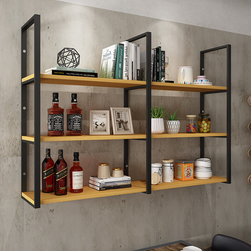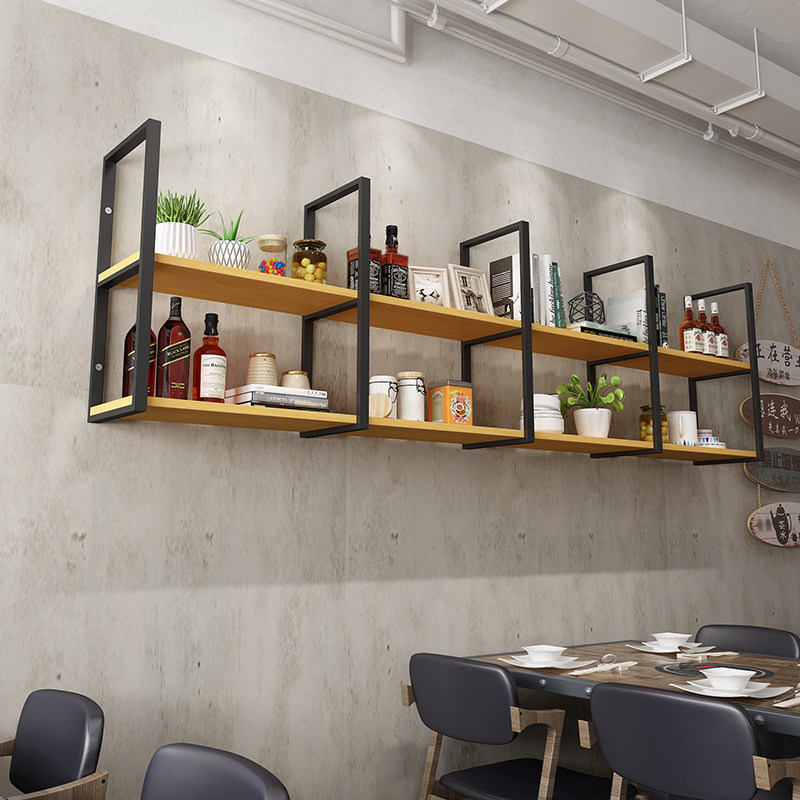 Iron Art Solid Wood Wall-mounted Shelve Hanger Milk Tea Shop Dining Room Wall Shelf Wine Rack Bar Counter Suspension Layer Shelf Custom