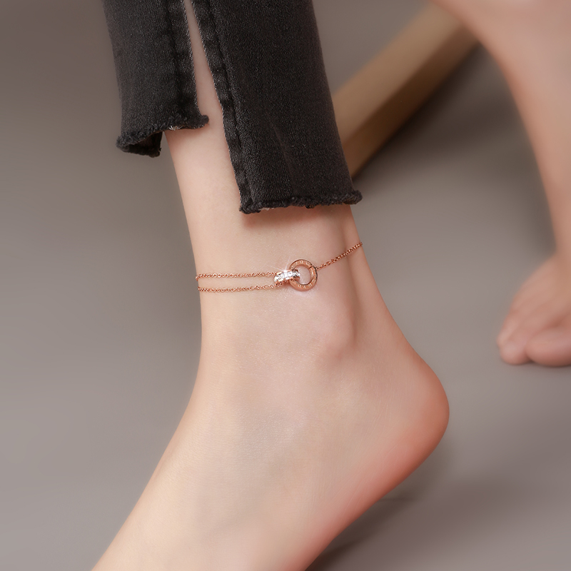 Double ring round diamond anklet 18K gold color