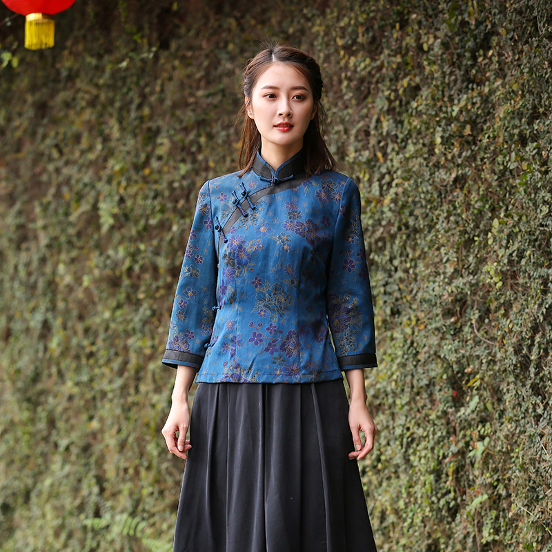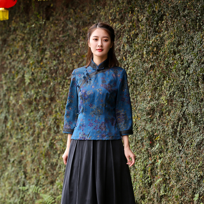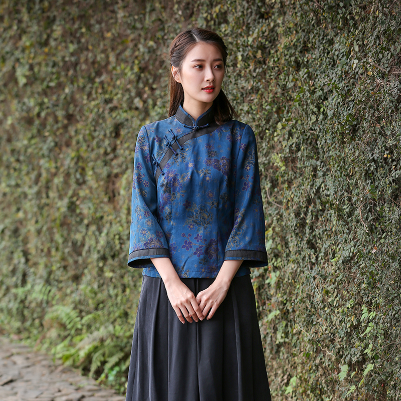 Autumn water ballad (Ran Chunhua) True silk fragrant cloud yarn improved flag-gown style blouses Long sleeves Republic of China Women's dress gown