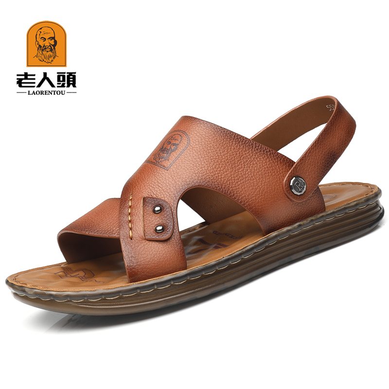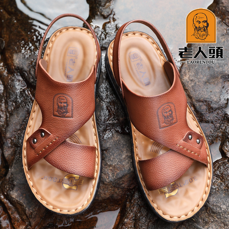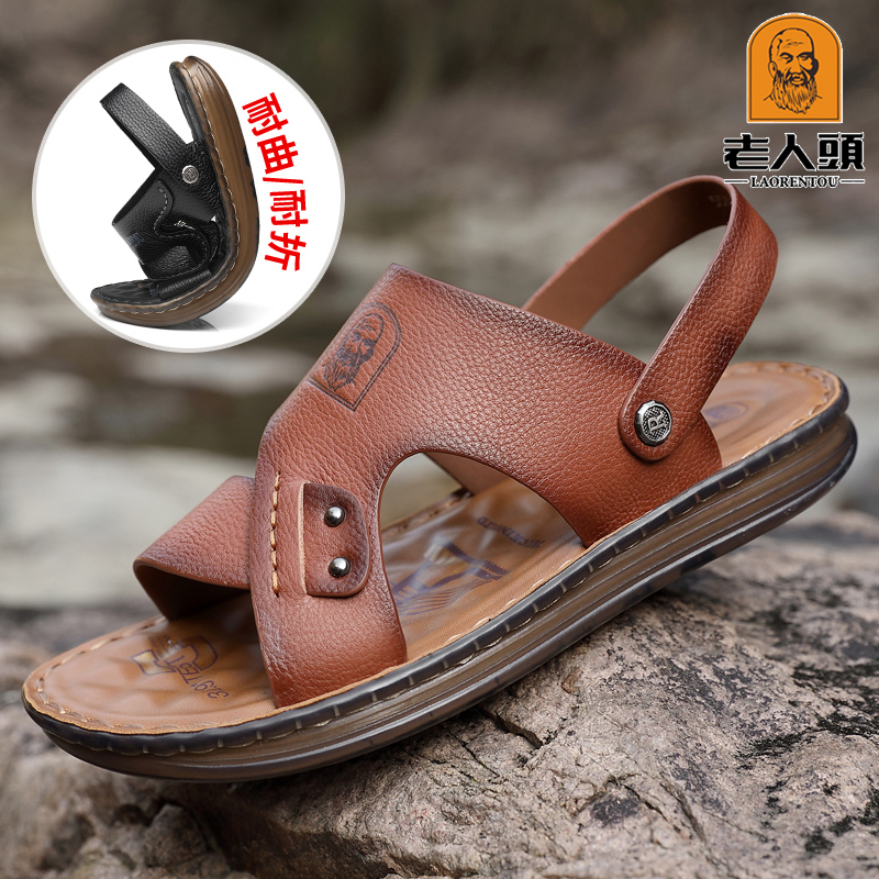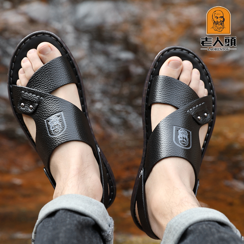 Old man's head sandals men's leather 2023 Summer Niu leather casual beach shoes Outdoor thick bottom non-slip middle-aged sandals-Taobao