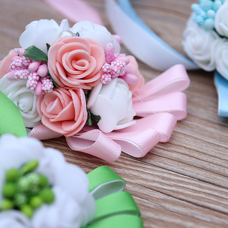 Red wrist flower (one) purple wrist flower (one) green white wrist flower (one) pink wrist flower (one) champagne two spelling wrist flower (one) blue and white wrist flower (one) champagne hand