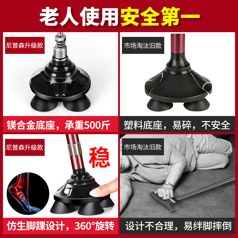 Nepson seniors Walking Stick Four Feet Telescopic Cane Old Crummy Aluminum Alloy Light Multifunction Belt Light Anti Slip Walking Stick