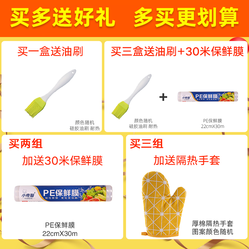8 meters a box (oil brush) 8 meters two boxes (oil brush) 8 meters three boxes (oil brush + 30 meters plastic wrap) 15 meters a box (oil brush) 15 meters two boxes (oil brush) 15 meters three boxes (oil brush + 30 meters plastic wrap) cooking paper 5 meters two boxes (send 30 meters plastic wrap)