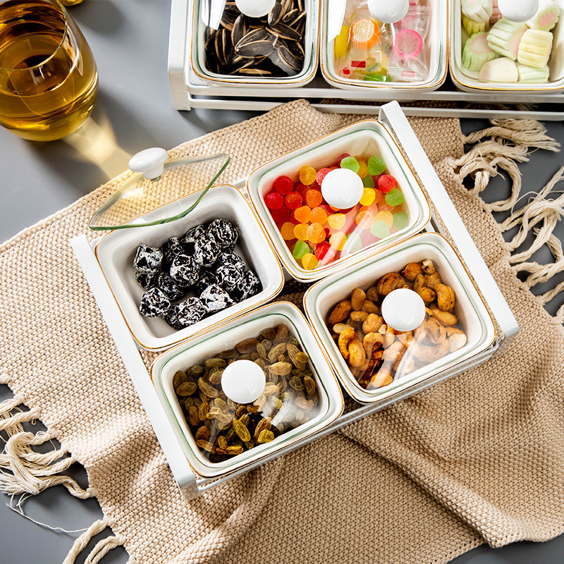 In Nordic Creative Ceramic Four-House Fruit Disk Household Living Room with Box Glass Cover Dry Fruit Disk