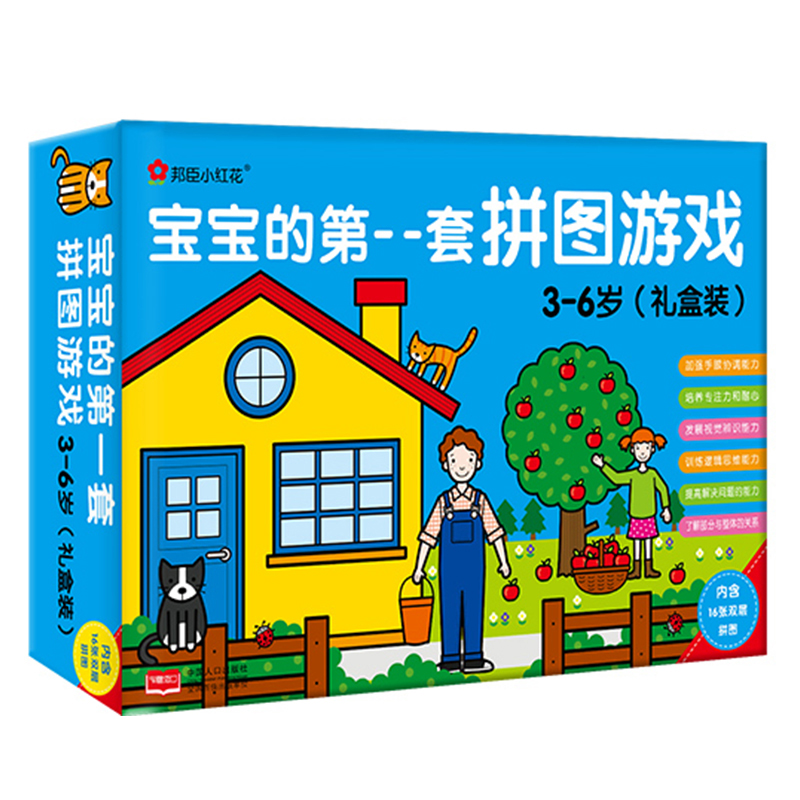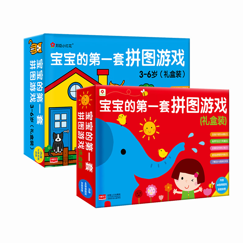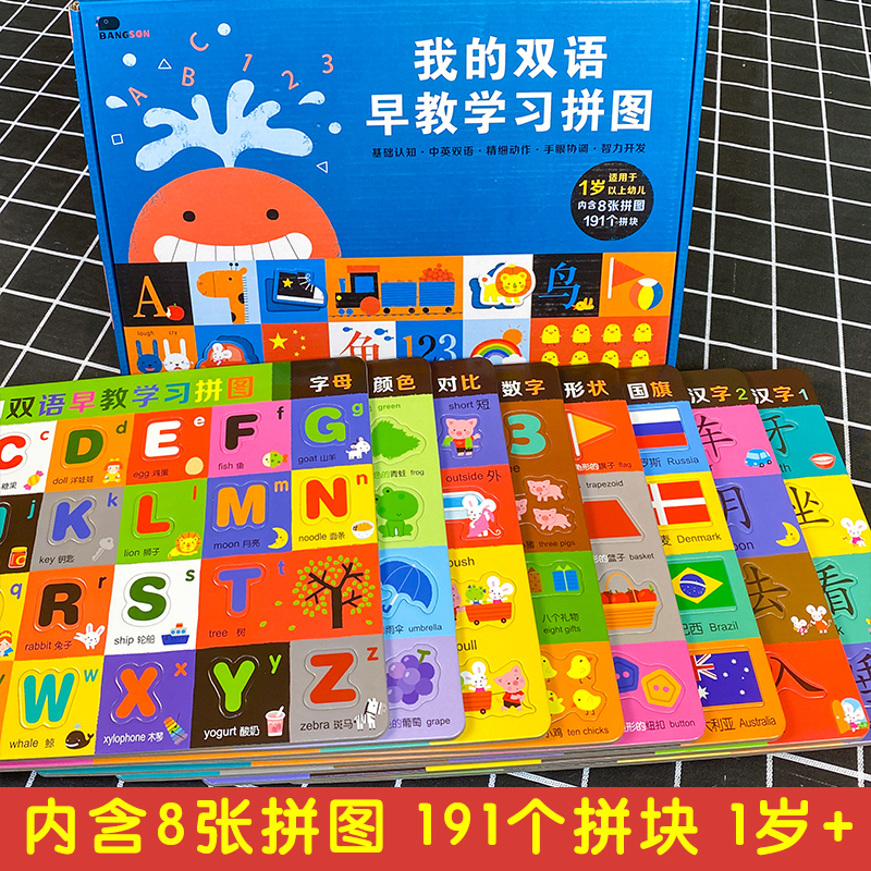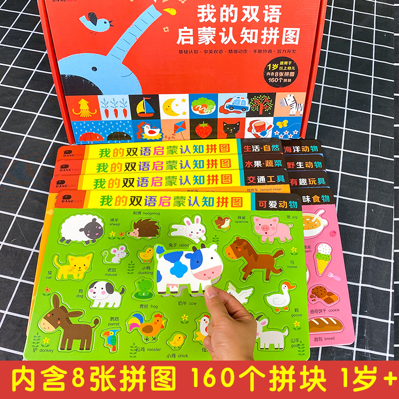 0-3 years old big red box 48 sheets 4-6 pieces with bottom support 3-6 years old big blue box 16 sheets 20~63 pieces with bottom support My bilingual enlightenment cognitive puzzle My bilingual early education learning puzzle