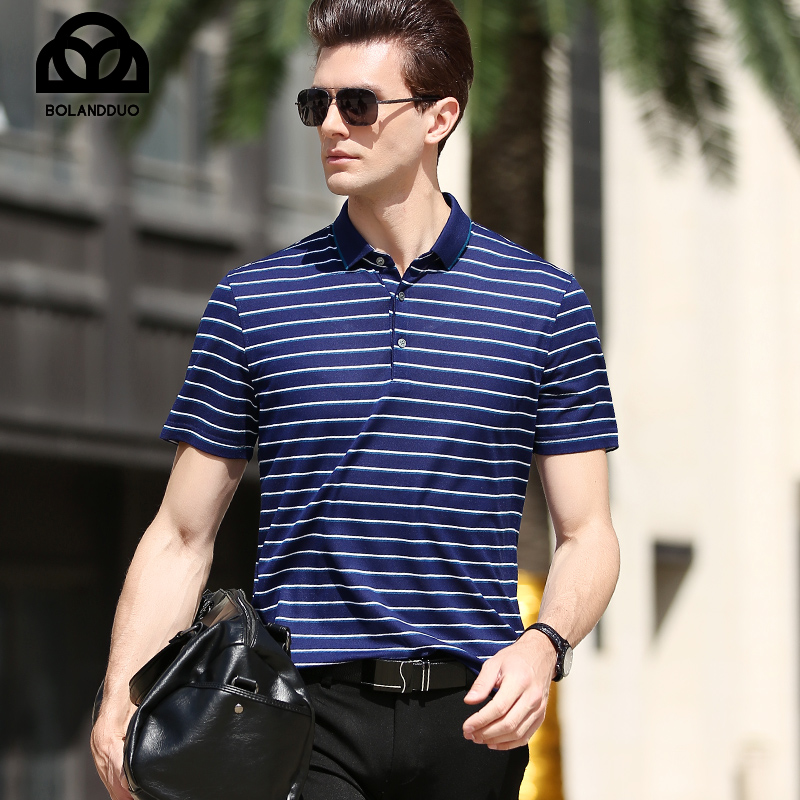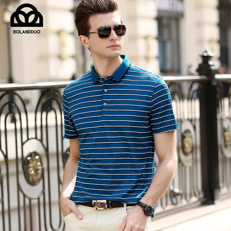 Middle-aged Mulberry Silk Men Short Sleeve T-shirt Striped 2022 Ice Silk Cotton Dad Business POLO Turned Collar Men's Clothing