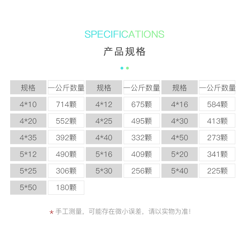 4*8 one kilogram (about 1000pcs) 4*101kg (about 893pcs) 4*121kg (approx. 869pcs) 4*141kg (approx. 787pcs) 4*161kg (approx. 695pcs) 4*201kg (approx. 572pcs) 4*251kg (approx. 519pcs) 4*301 kg (approx. 455pcs) 4*351kg (approx. 394pcs) 4*401kg (approx. 366pcs) 4*501kg (approx. 290pcs) 5* 101 kg (about 552pcs) 5*121kg (about 515pcs) 5*161kg (approx. 405pcs) 5*201kg (approx. 353pcs) 5*251kg (approx. 312pcs) 5*301kg (approx. 292pcs) 5*351 kg (approx. 255pcs) 5*401 kg (approx. 228pcs) 5*501kg (approx. 180pcs) Specifications