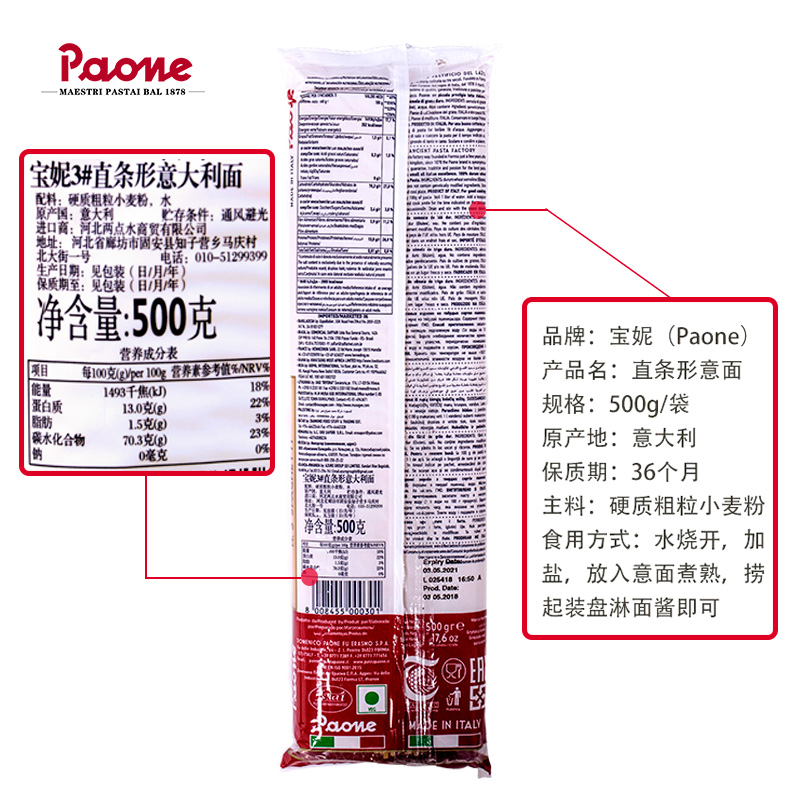 Bao Ni imported Italian noodles straight noodles Western pasta Household instant pasta macaroni 500g