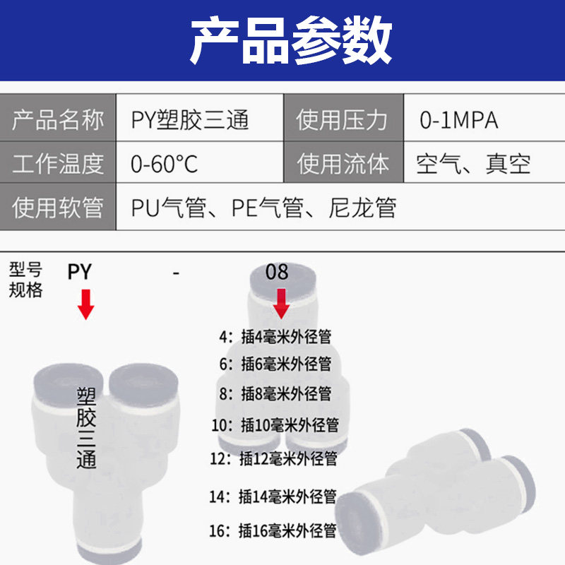 Pneumatic Y-type three-way plastic trachea connector PY4 6 8 10 12 16MM trachea cylinder quick plug connector