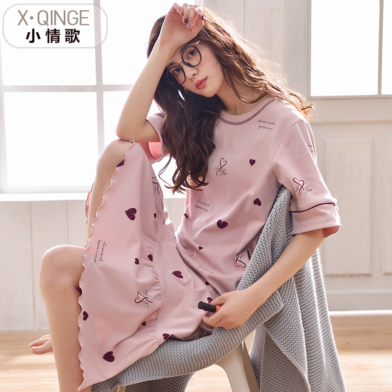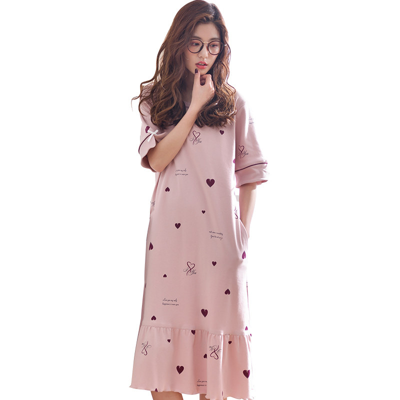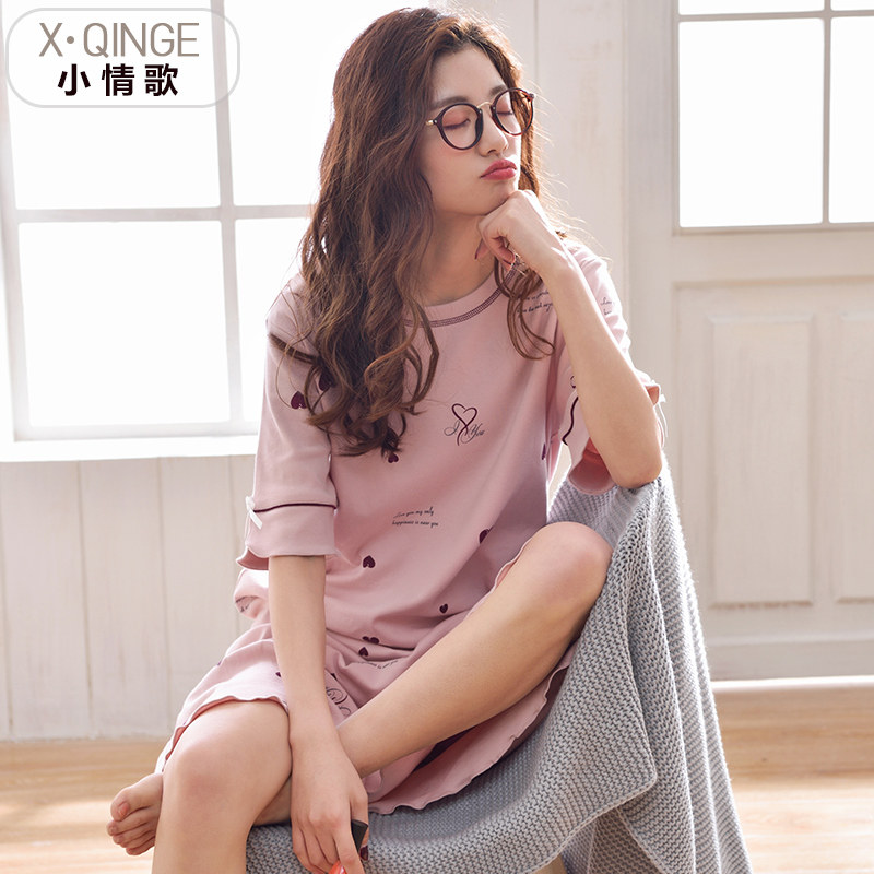 Nightdress women's summer pure cotton mid-length thin section pregnant women's knee-length cotton silk cute one-piece pajamas skirt summer home service