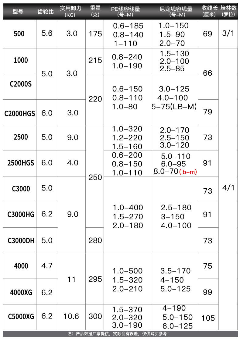 1000 C2000S (shallow cup) C2000HGS (compact fuselage + high-speed gear ratio + shallow cup) 2500HGS (high-speed gear ratio + shallow cup) 2500 C3000 (compact body) C3000HG (compact body + high-speed gear ratio) C3000DH (compact fuselage + double grip) 4000 4000XG (super high-speed gear ratio) C5000XG (compact fuselage + ultra-high-speed gear) 500 (horse-muzzle wheel) has a reverse stop switch