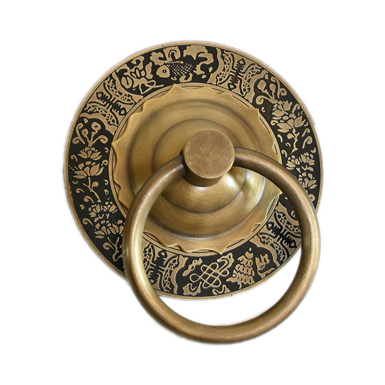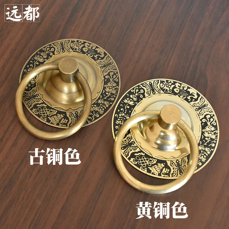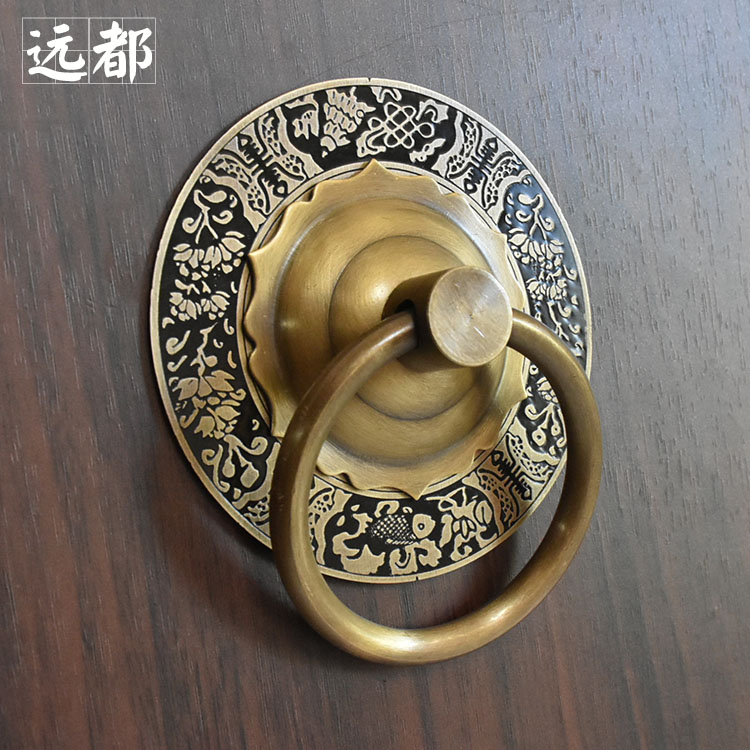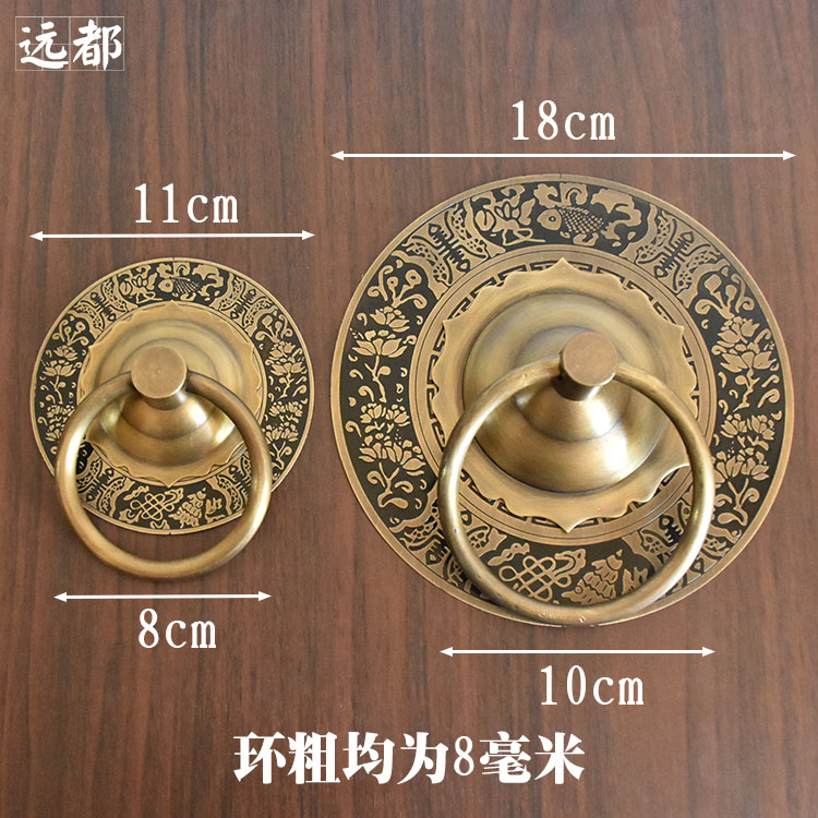 Antique large door handle Chinese vintage retro solid wood large door handle old round patterned pull ring pure bronze beast head door ring