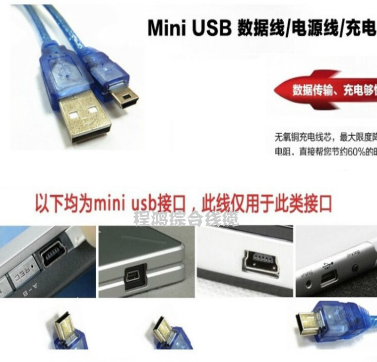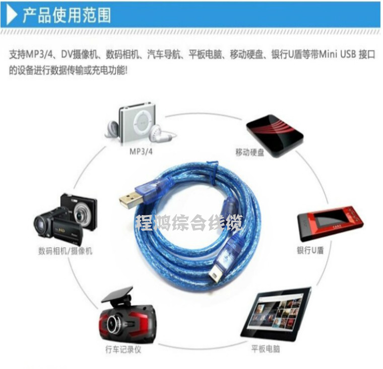 Car navigation tachograph T-type interface cable mini 5pin to USB2 0 T-port cable blue shield 3 meters
