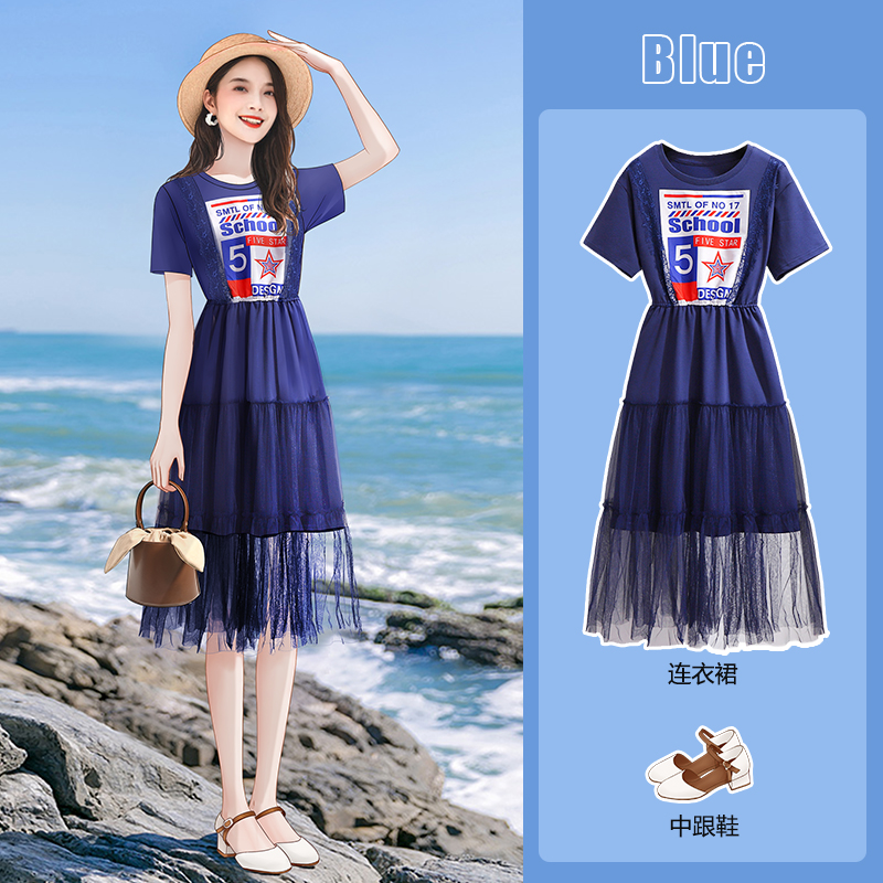 Blue printed foreign dress Women 2022 Summer new style Temperament Short Sleeves Cashew THIN WEB YARN A Wordskirt