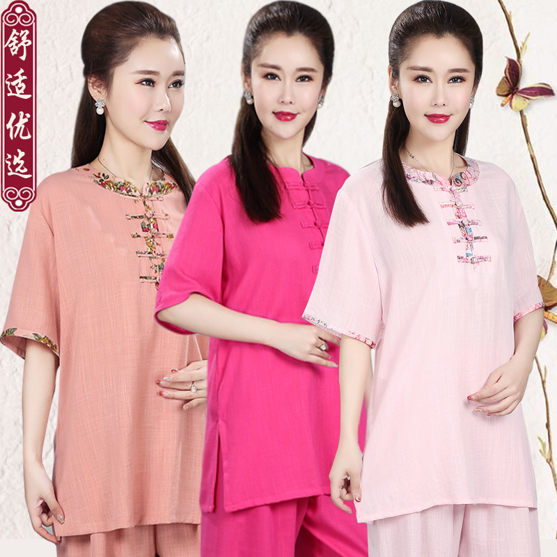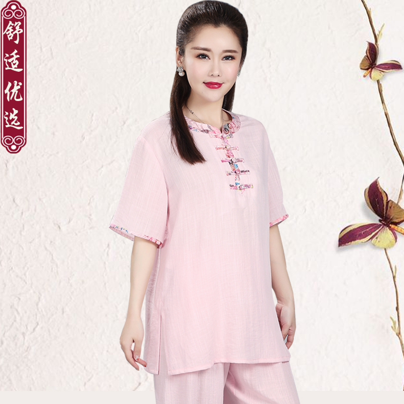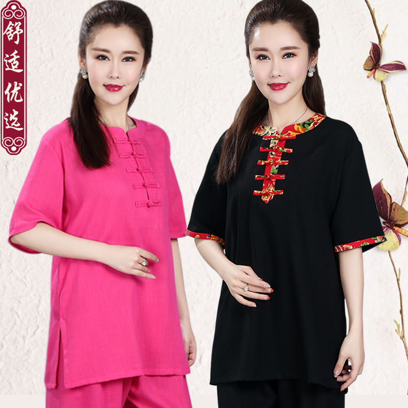 Tai Chi Clothing Spring Summer Dress New Cotton Linen Short Sleeve Linen Cotton Martial Wear non-middle-sleeve middle-aged practice Gongfu Performance Morning Exercises