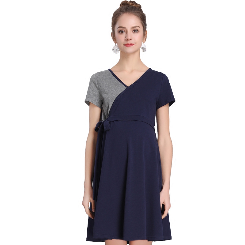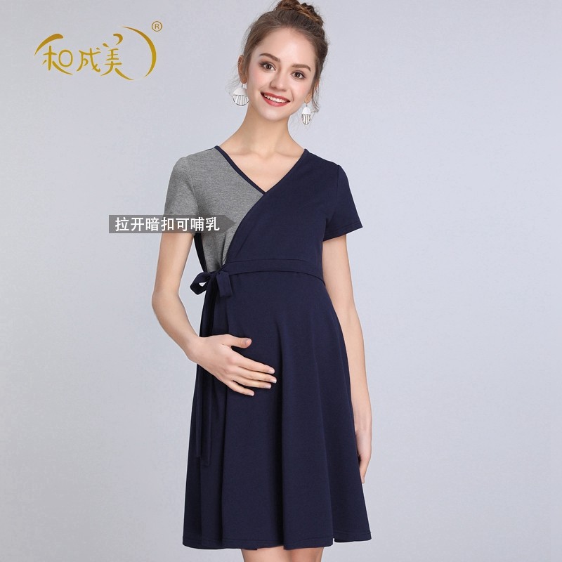 Pregnant women summer round neck short-sleeved breastfeeding dress female OL business color matching cotton knitted mid-length pregnant women's dress tide