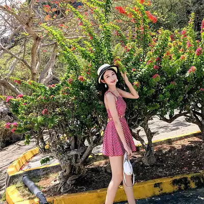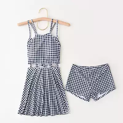 Swimsuit women's plaid one-piece student small chest gathered skirt type belly cover conservative thin flat angle hot spring 2021 new