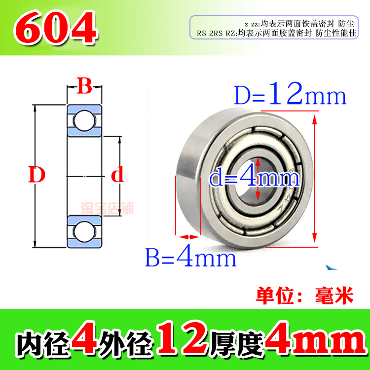 604ZZ(4*12*4mm) Boutique 604ZZ(4*12*4mm) Model Inner diameter*outer diameter thickness Unit mm For other specifications, please consult customer service