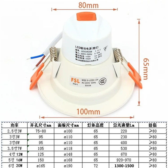 2 5 inch 5W opening 7~8 cm White light 2 5 inch 5W opening 7~8 cm Yellow 3 inch 6W open 9~9 8cm White 3 inch 6W open 9~9~6 cm White light 3 inch 6W open 9~