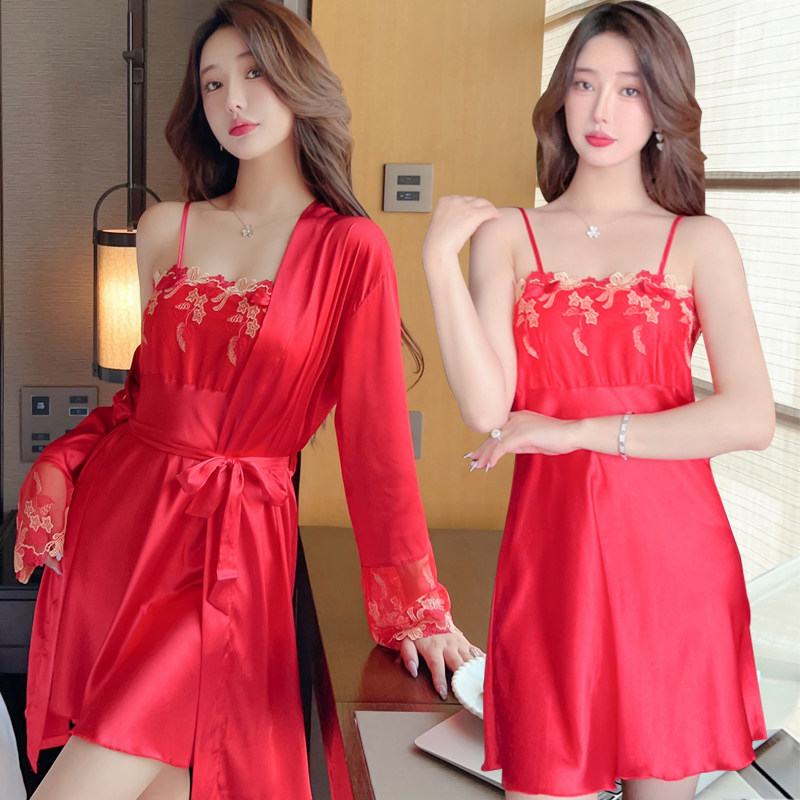 Summer Sexy Sleepwear Women Spring Fall Long Sleeve Ice Silk Harnesses Sleeping Dresses Silk Sleeping Robes Slim Short Skirts Two Suits-Taobao