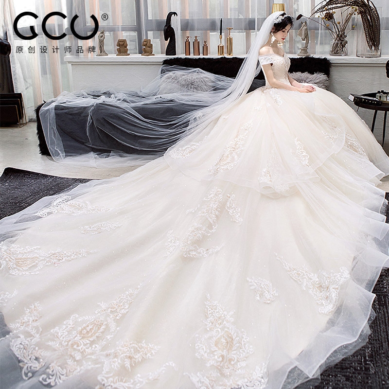 Word shoulder French main wedding dress 2021 new bridal tail luxury temperament light wedding dress female small man cover arm