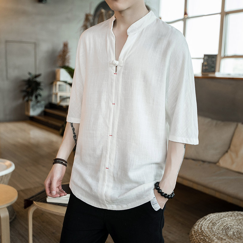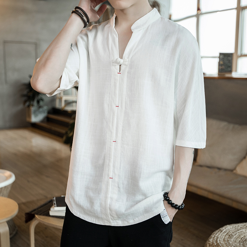 Summer retro youth cotton linen T-shirt short sleeve men's large size blouse V collar Chinese wind men's 70% sleeves clothes damp