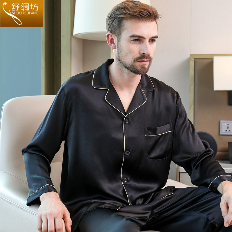 Shu silk square heavy silk pajamas Men's solid color long sleeve trousers Mulberry silk home wear suit spring and autumn and summer
