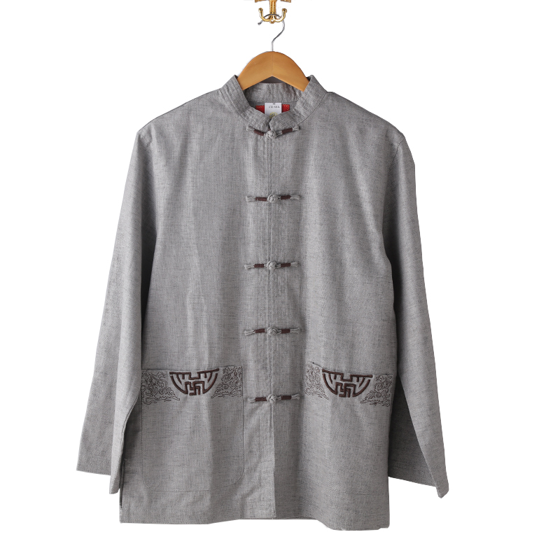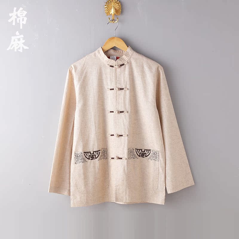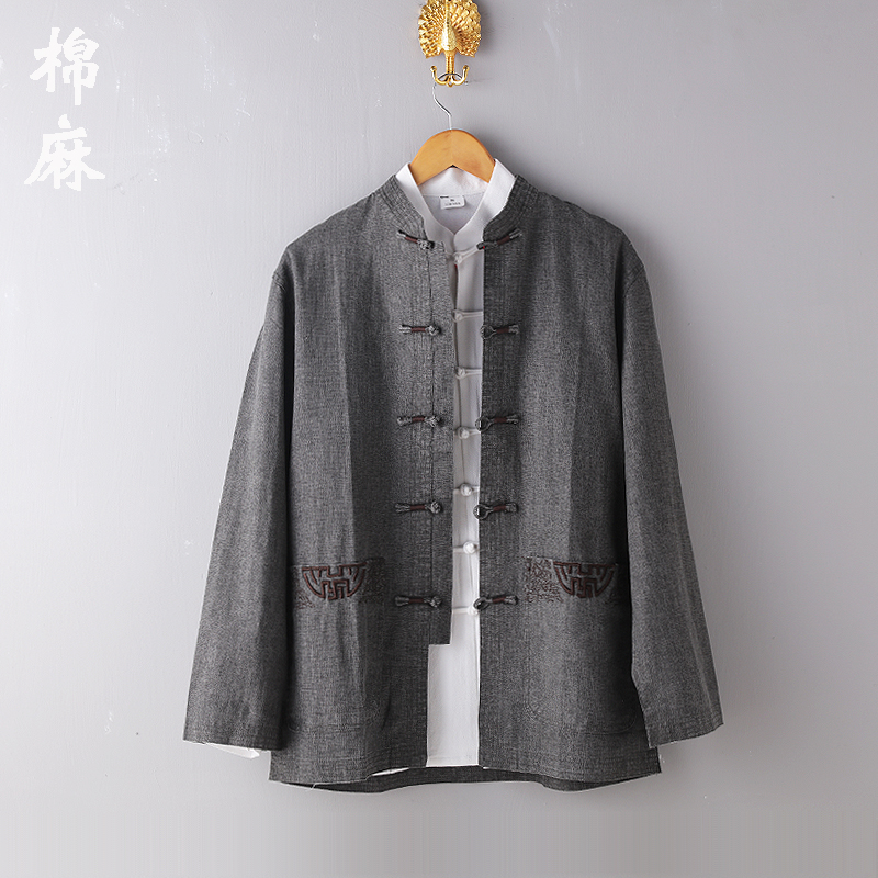 Middle-aged and elderly men's long sleeves Chinese style spring and summer standings linen shirt disc buckle cotton linen blouse men's men's men's men 's