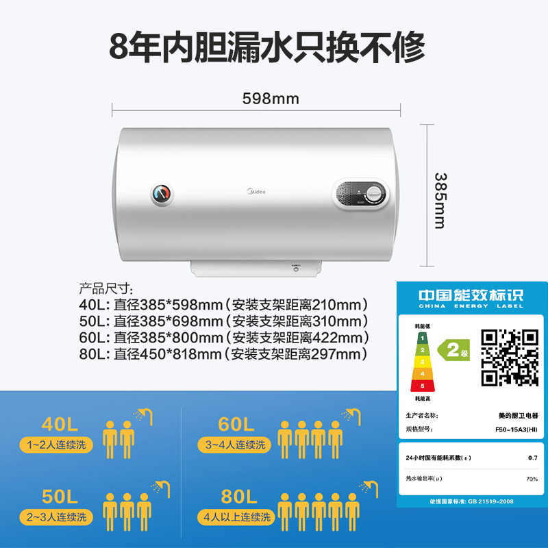 Midea 40 50 60 liter electric water heater home small rental room speed heat storage water bathroom bath 15A3