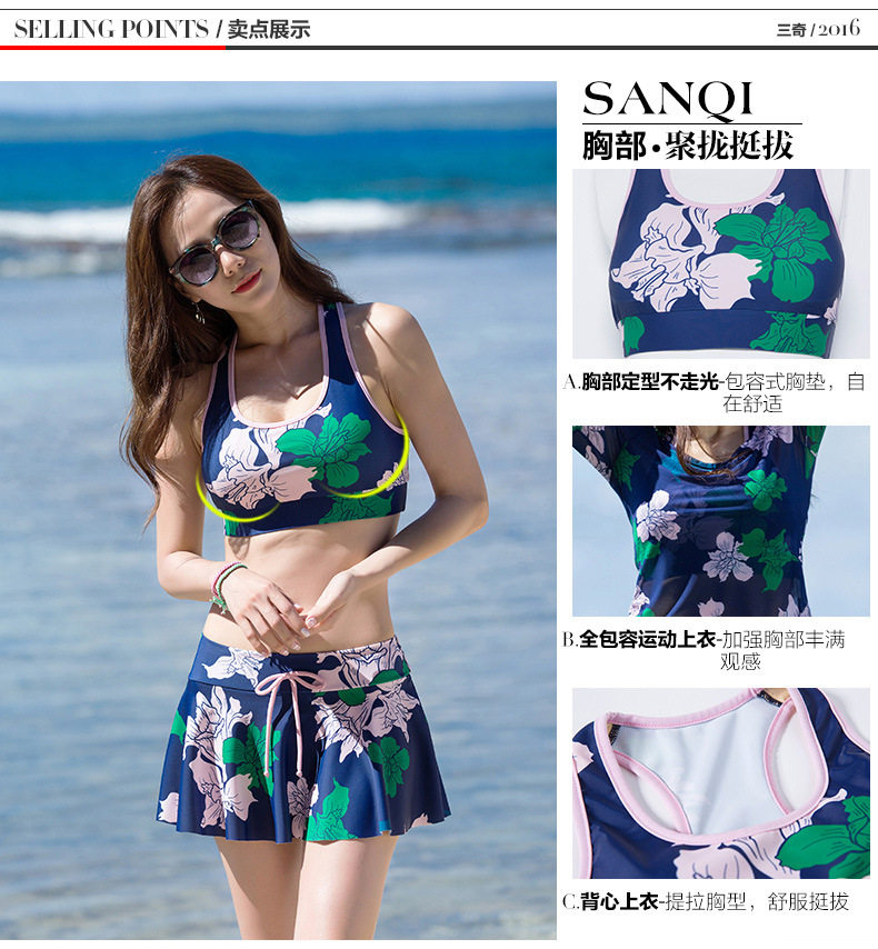 Korean women's three-piece swimsuit conservative split skirt floral bikini small fresh hot spring slim backless swimsuit