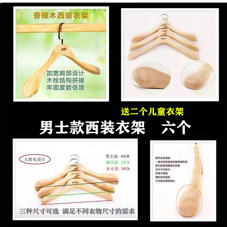 Thickened universal models Ten women's thickened suit hangers Six men's thickened suit hangers Six camphor wood tie racks Three bottom pants clips Universal models ten curved women's models ten curved men's models ten round rods