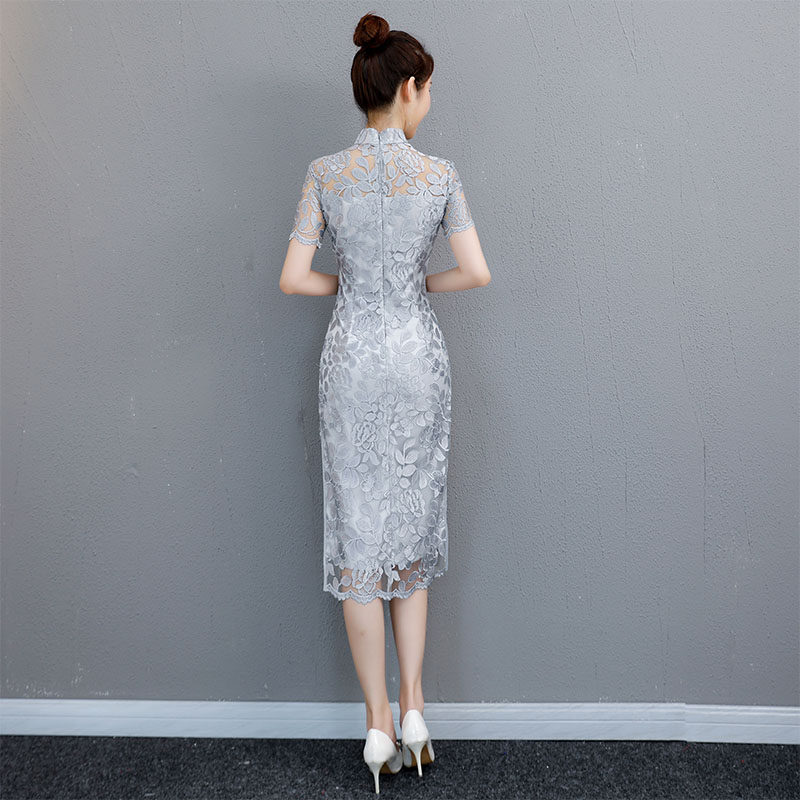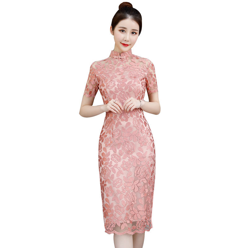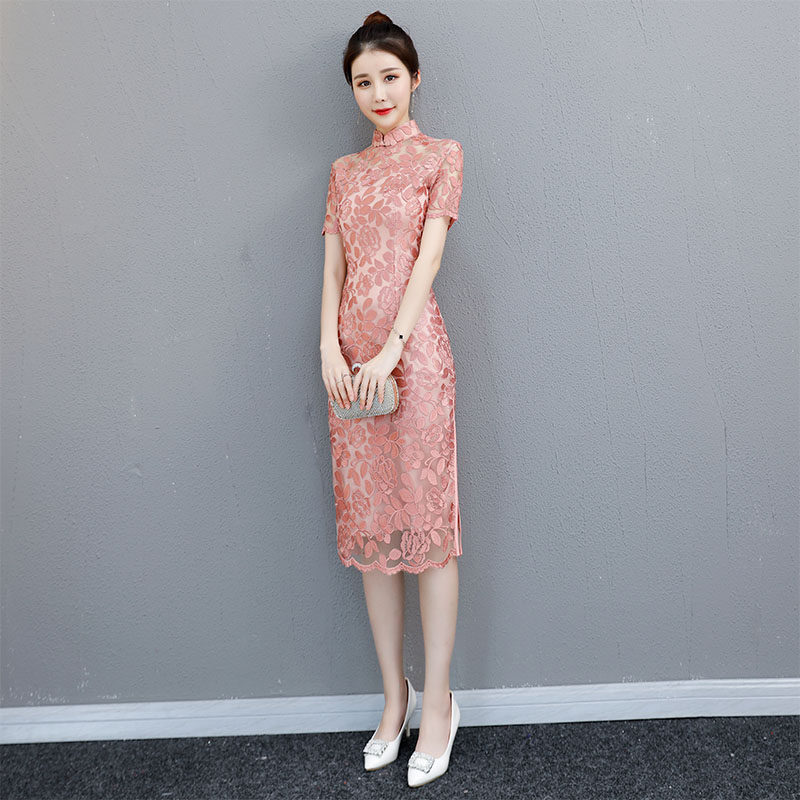 Erosion Bone Cheongsam Young middle country Wind Girls retro short sleeves lace Daily Qipao Style Foreign Dress Mid-Length