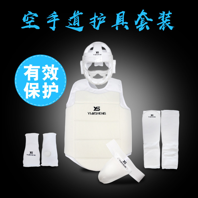 Yinsheng karate protective gear 5-piece set Full set of Kyokushin protective gear Head cover helmet armor leg protection Crotch protection Hand protection