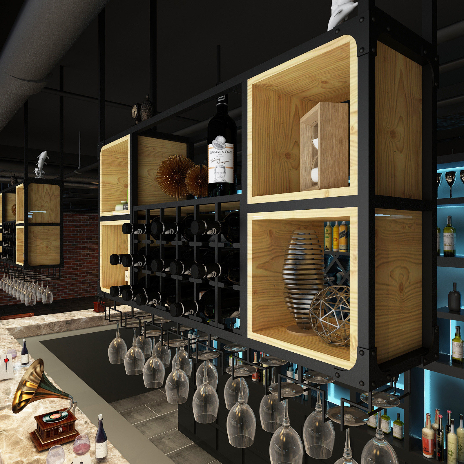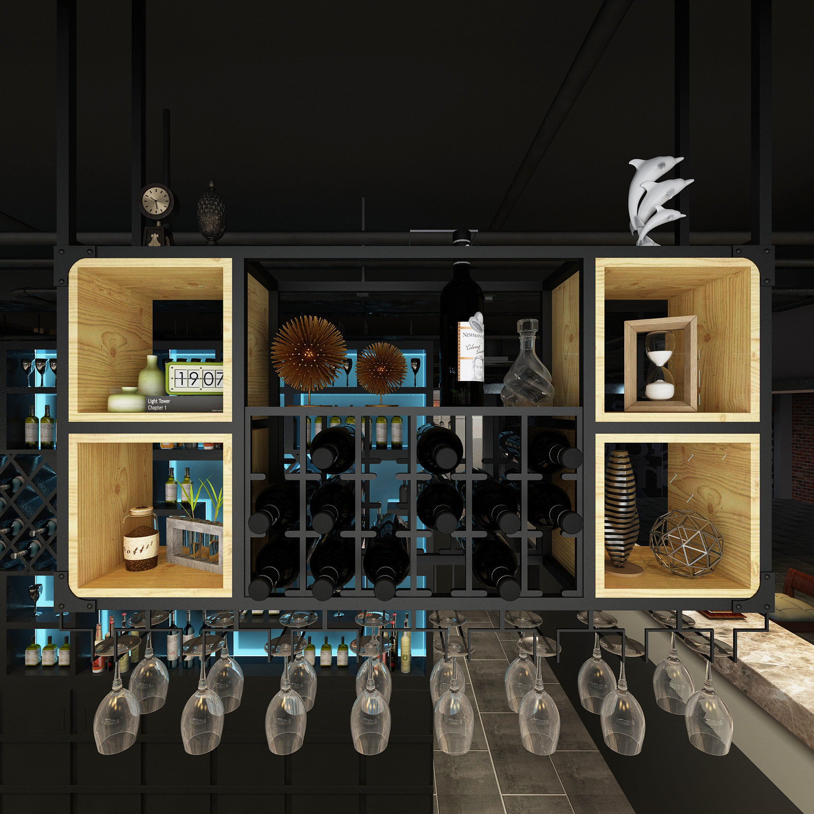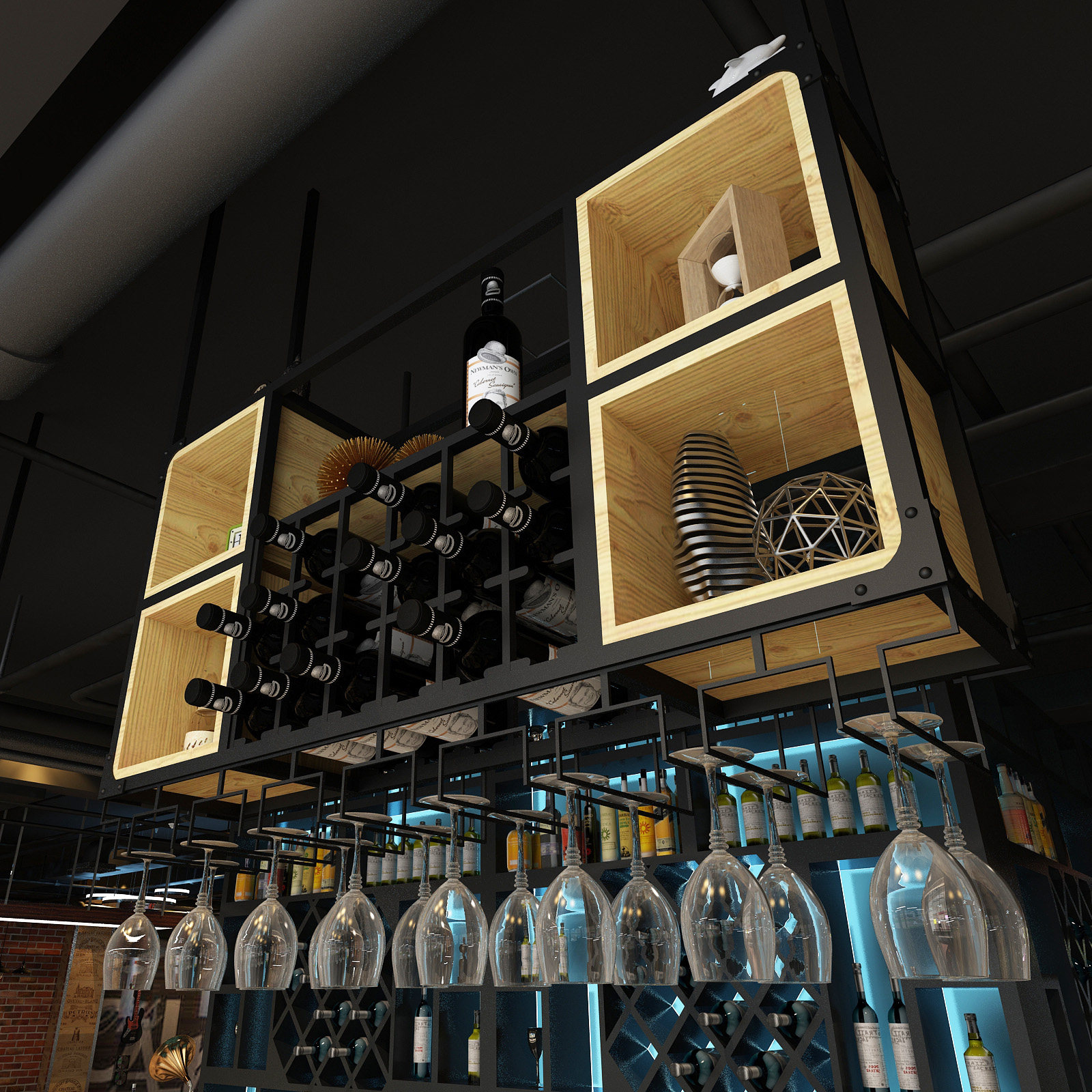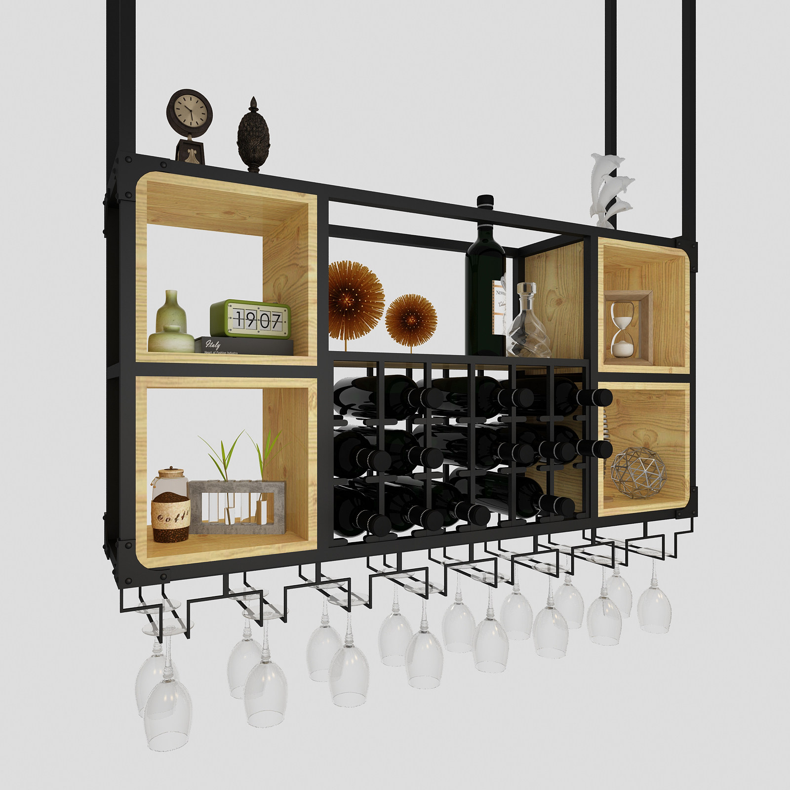 Industrial wind hanger wine cabinet bar wall-mounted household red wine goblet upside-down wrought iron solid wood rack ceiling
