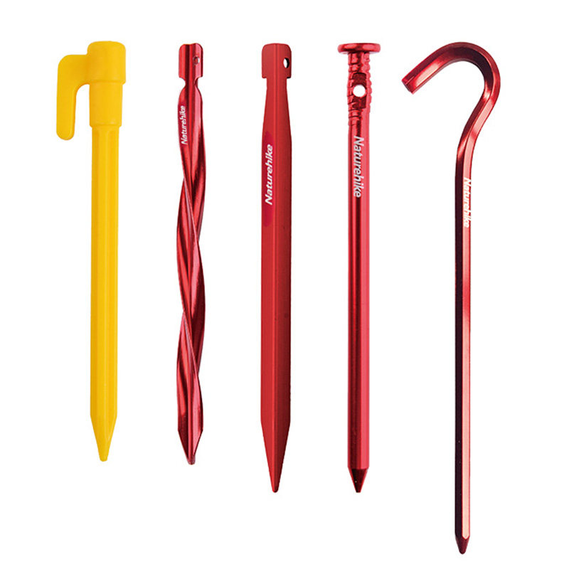 Small spiral aluminum ground nails (8 packs) Large spiral aluminum ground nails (4 packs) Cylindrical flat head aluminum ground nails (6 packs) V-shaped aluminum ground nails (8 packs) Hexagonal hook aluminum ground nails (6 packs) Curved snow aluminum ground nails (4 packs) Small plastic round head with hook nails (6 packs) Large plastic belt hook nails (4 packs)