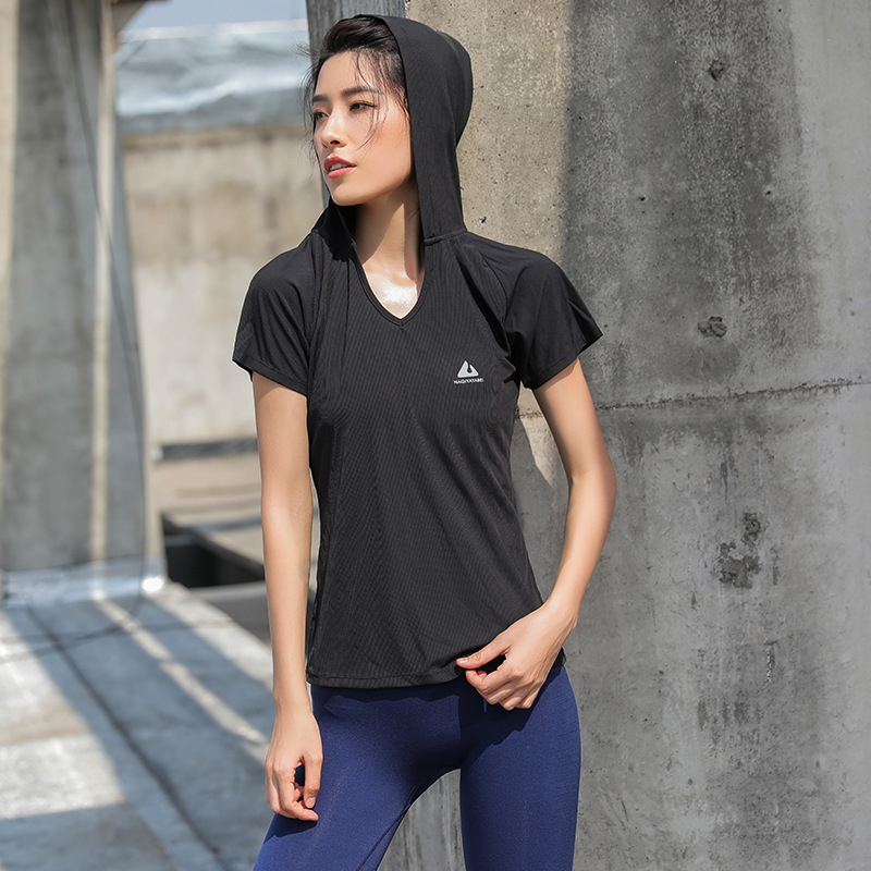 Fitness women's summer training short sleeve hooded blouse loose breathable solid color sports T-shirt