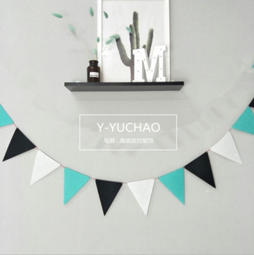 Light-colored pink-blue-yellow triangular flag 1 black-and-white gray triangular flag 1 dark pink-blue-yellow 1 white-black-green triangular flag 1 pink-grey-white triangular flag 1 white-gray-black-green ball 1 string powder gray-white ball 1 string white powder rose