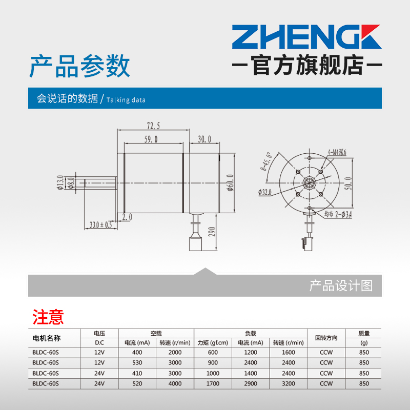 Zhengk Zhengko BLDC-60SRZ-S Adjustable Speed Brushless Reduction Motor Central Axis 12V 24V