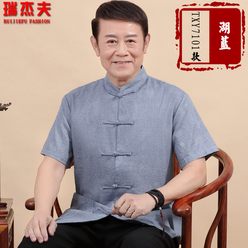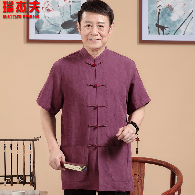 Chinese style Tang suit men's short-sleeved linen top Chinese style cotton and linen Hanfu middle-aged and elderly large size dad's summer jacket