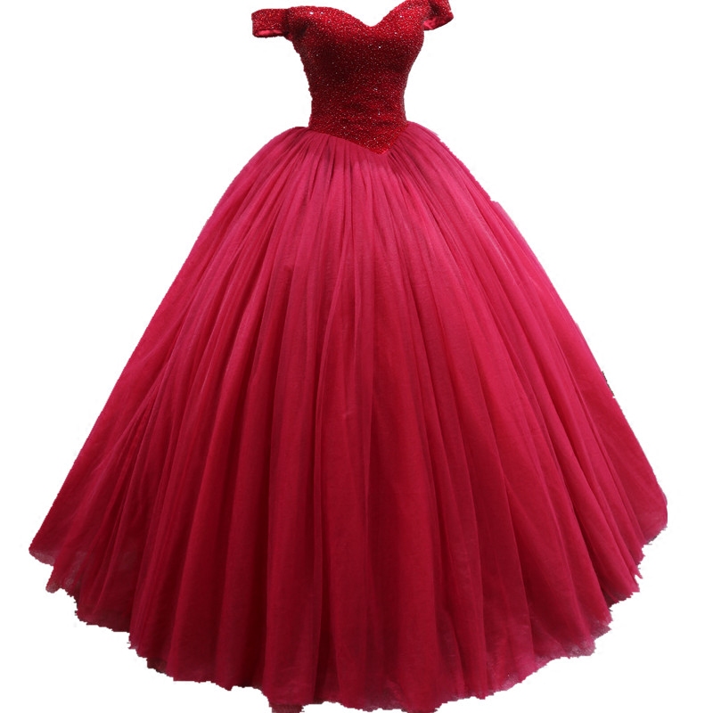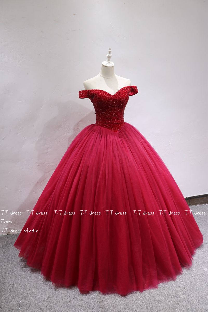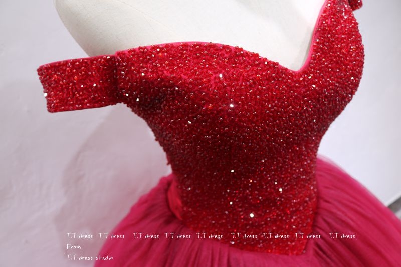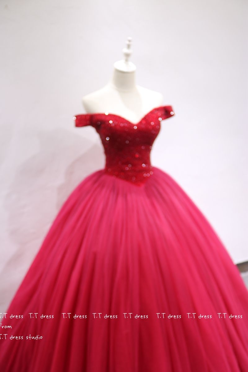 Red Wedding Dress Fashion lined with Shoulders Bride to greet Bed in bed Back to door Banquet hosted Pompon Dress