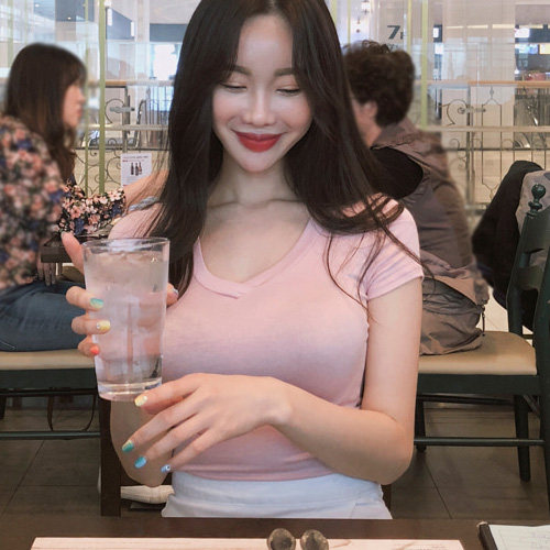 Day to day Korea love this subreddit color sexy deep V collar tight fit short sleeve T-shirt TO059