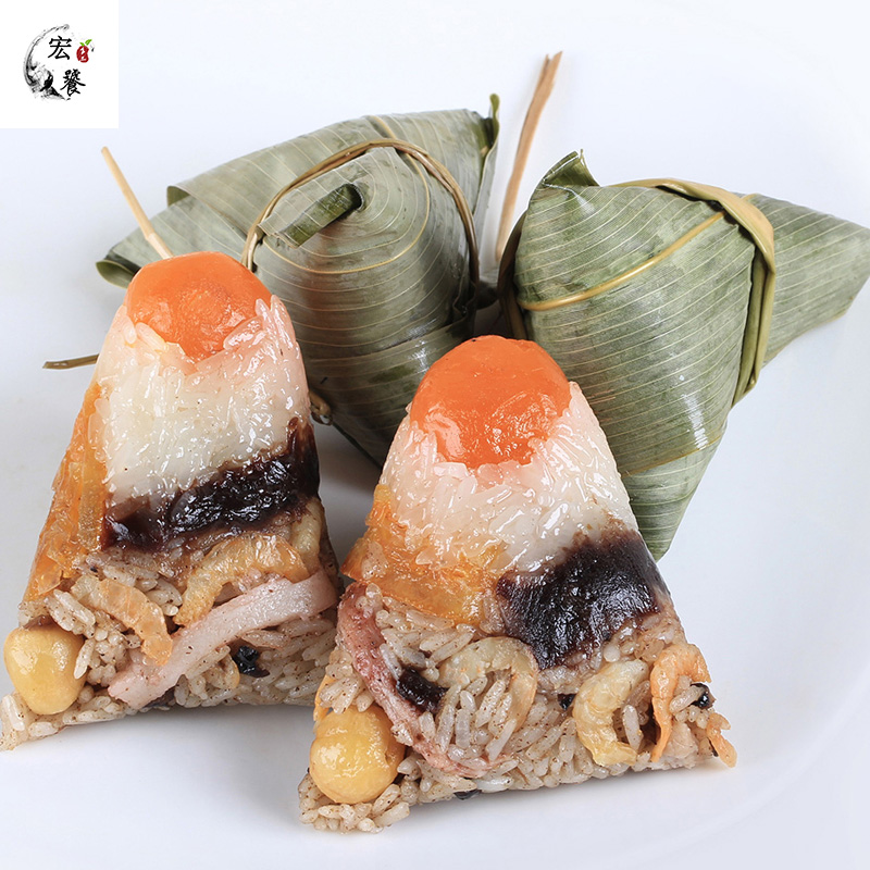 Glutinous rice, egg yolk, pork, shiitake mushrooms, shrimp, bean paste, etc.