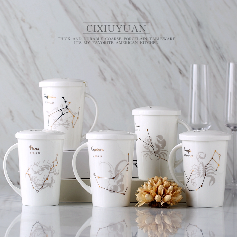 Bone china cup real gold twelve constellation cup ceramic mug couple water cup personality milk coffee cup with lid spoon